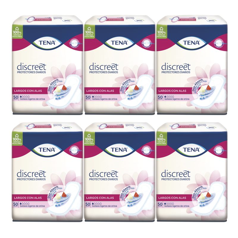 Combo de 6 paquetes de Protector Tena Discreet Largo con Alas x 50 unidades Protector diario de 19cm con alas para mayor seguridad que absorbe ligeros goteos de orina y flujo vaginal.