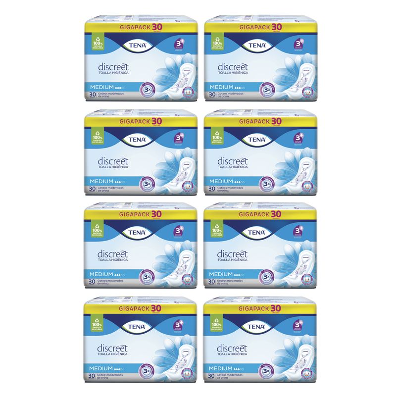 Combo de 8 paquetes de Toalla Tena Discreet Medium x 30 unidades. Toalla higiénica goteos moderados de orina. Similar en tamaño y forma a una toalla higiénica nocturna.